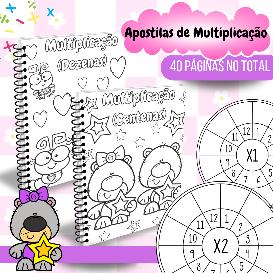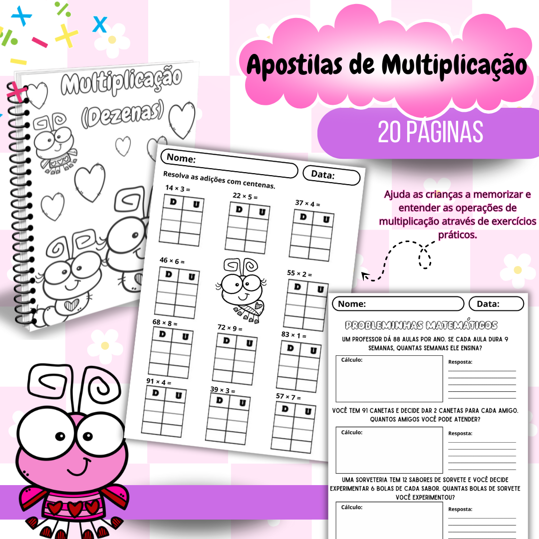✅ 2 apostilas de exercícios de multiplicação, com 20 páginas cada;