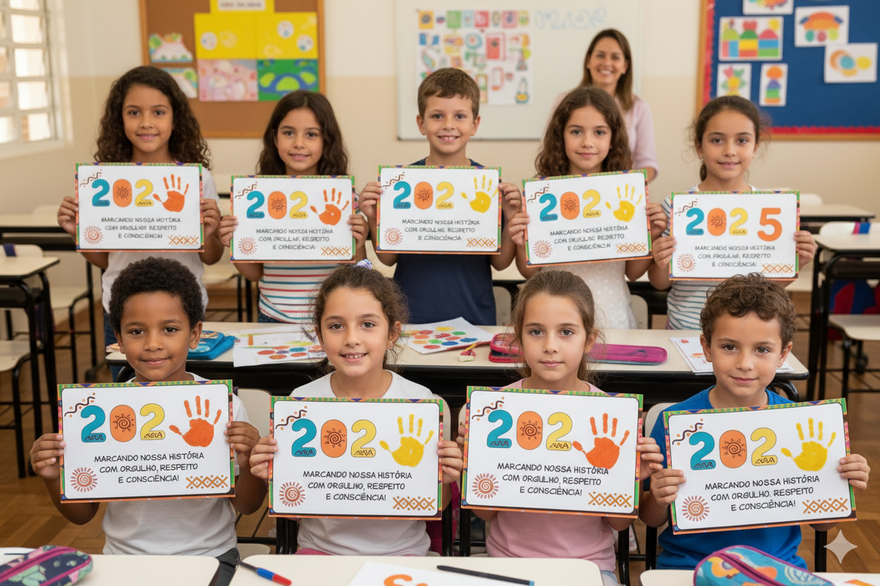 Mensagem: A placa simboliza um ano de História, Respeito e Consciência, com cores e grafismos inspiradores.