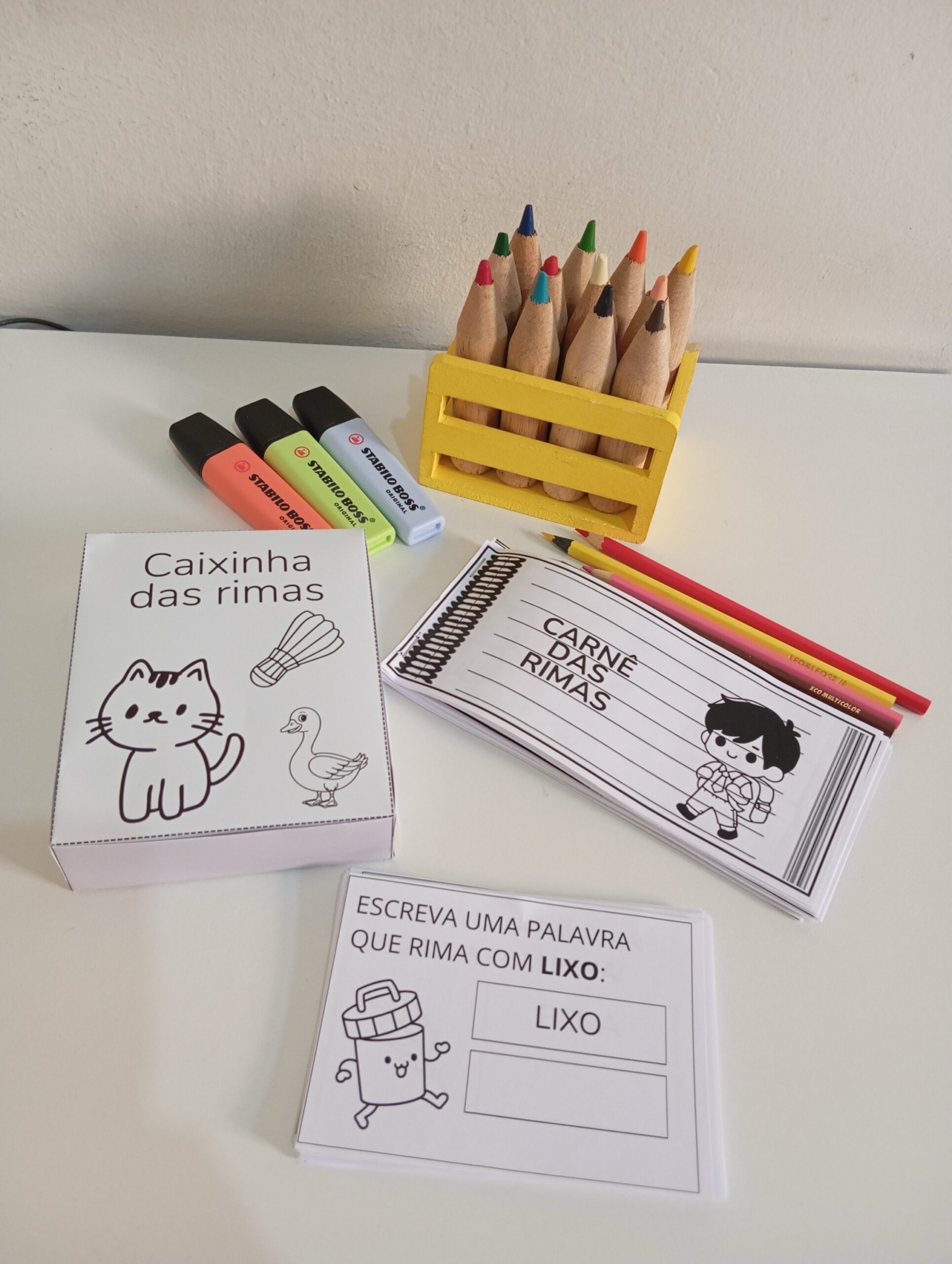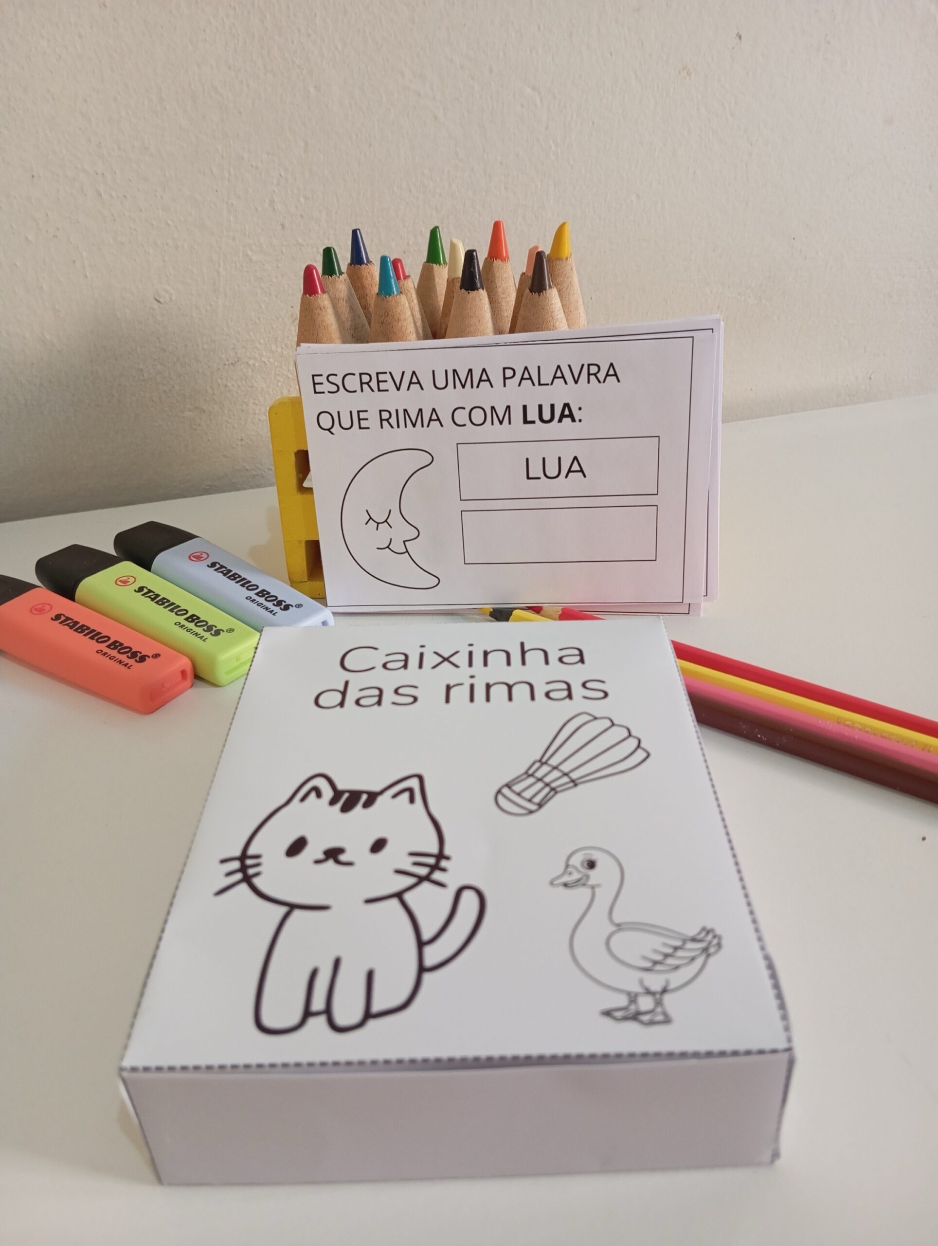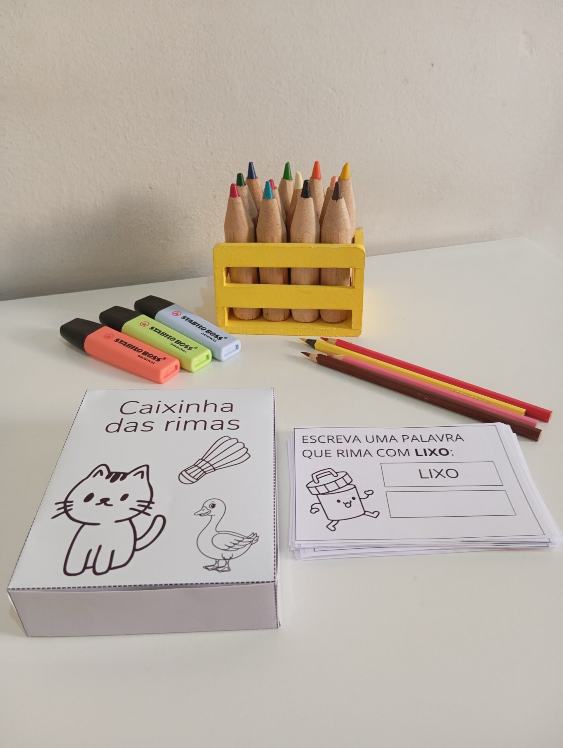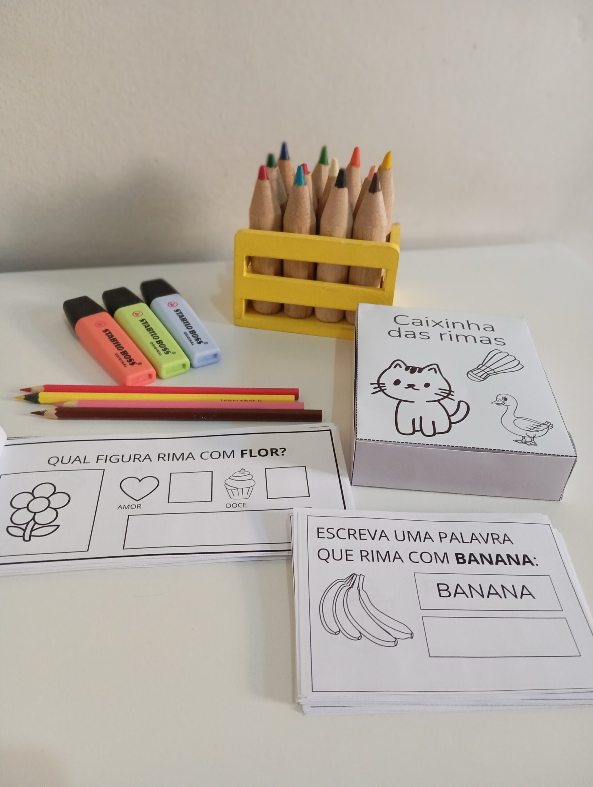 🎁 A caixinha vem com cartões para brincar de rimar em qualquer lugar.