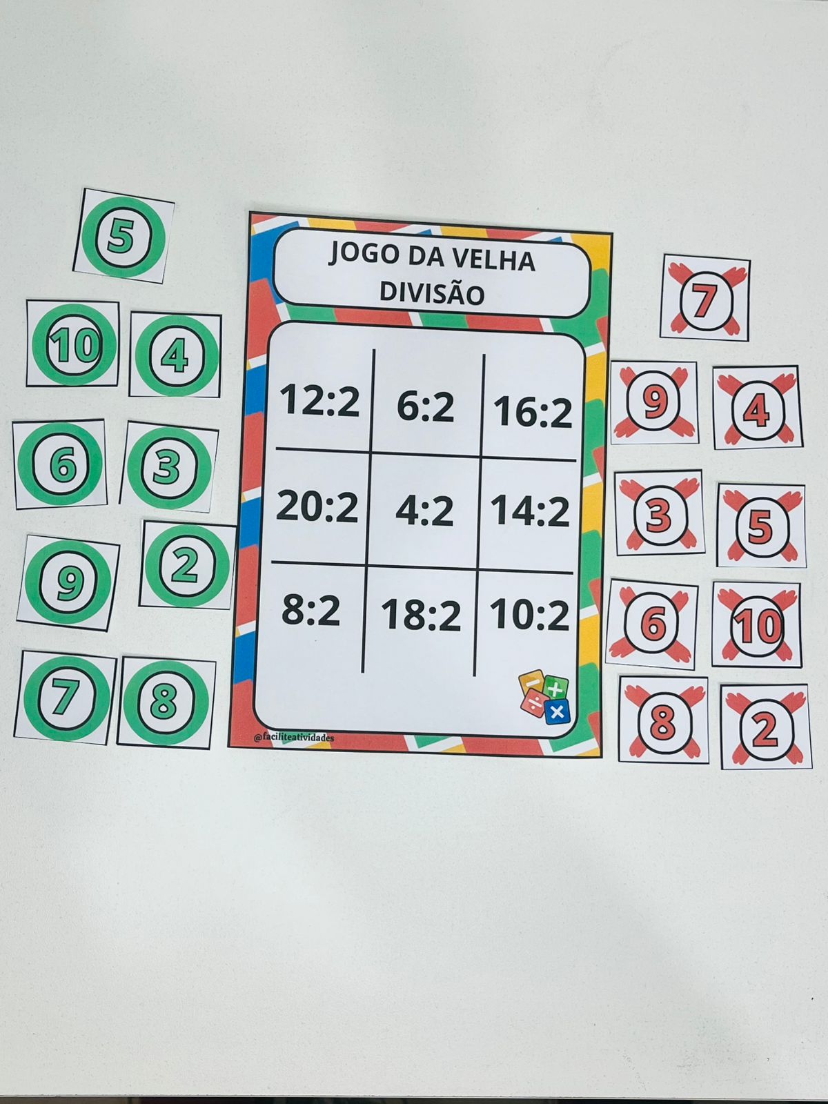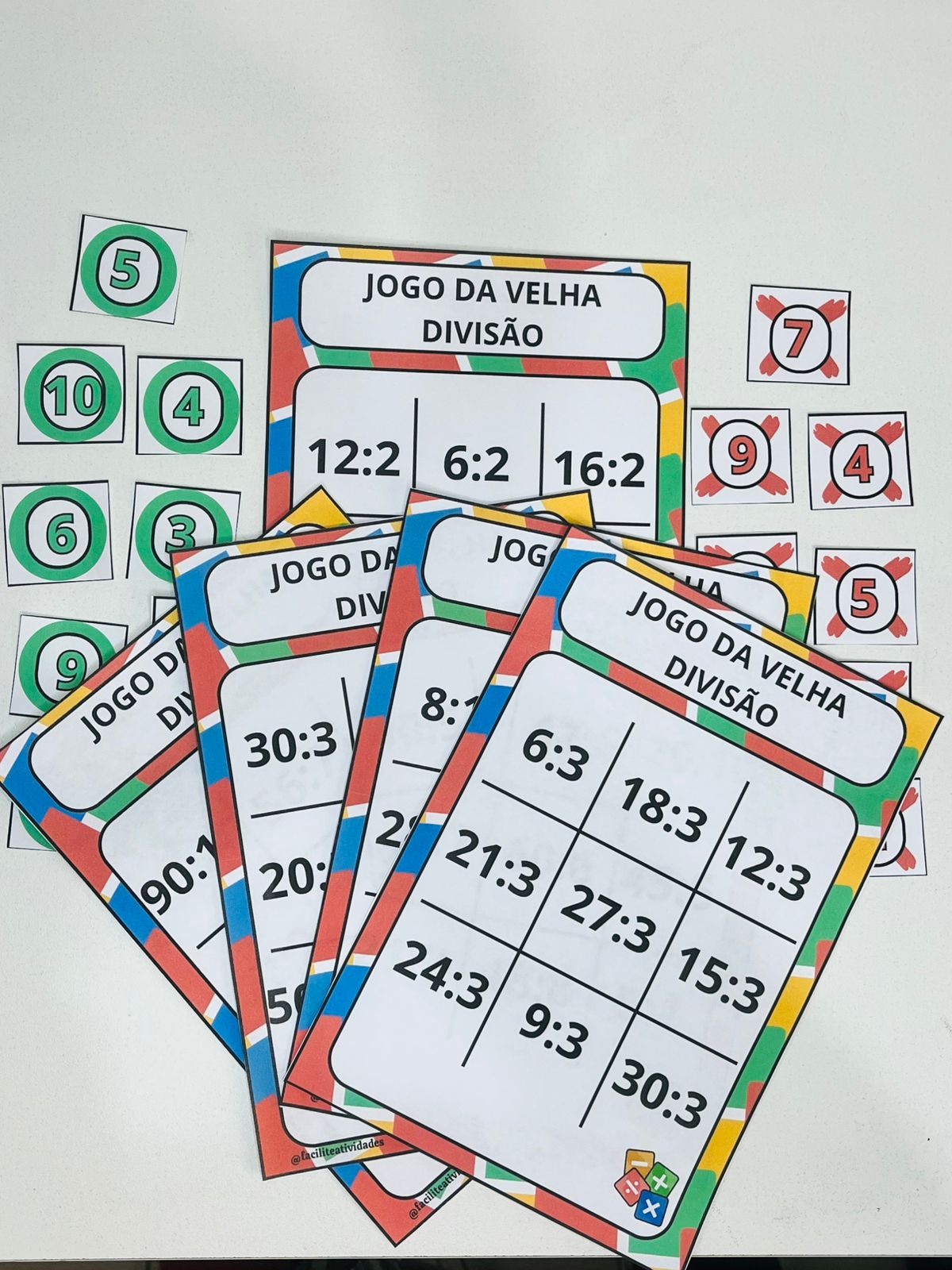 🎯 Objetivo do jogo: Resolver as divisões corretamente para marcar o espaço na cartela e completar três quadradinhos em sequência — na horizontal, vertical ou diagonal, como no tradicional jogo da velha.