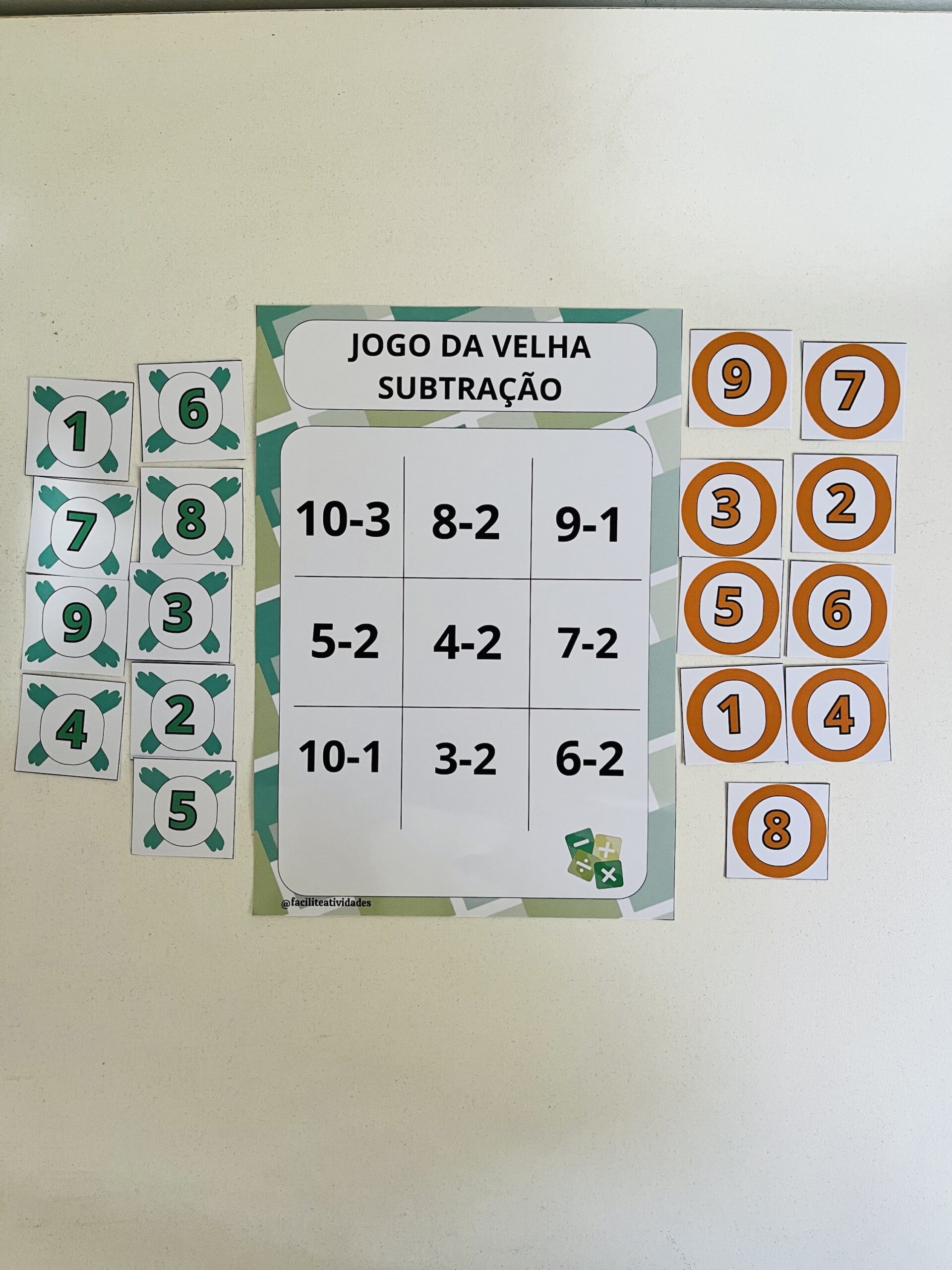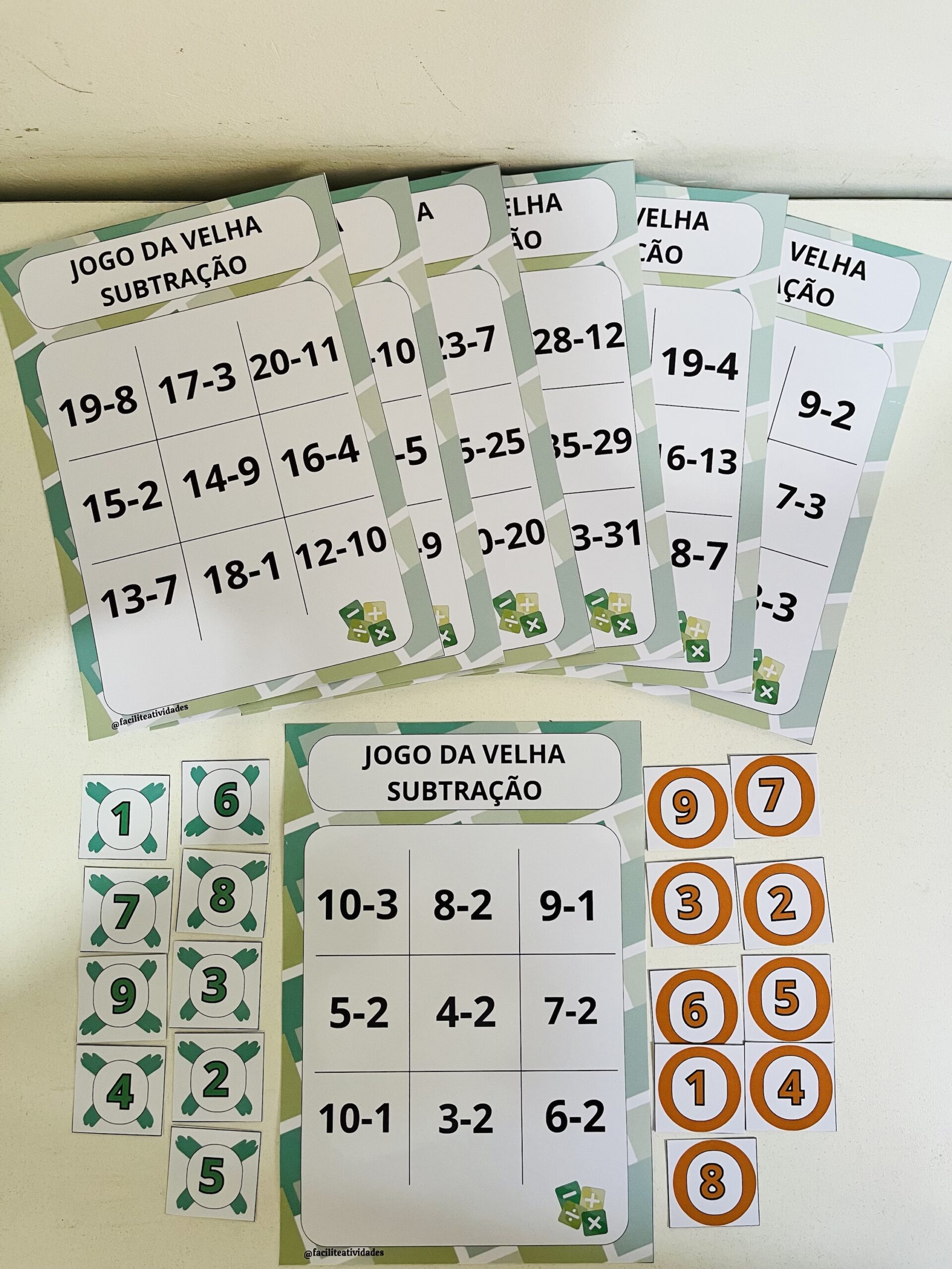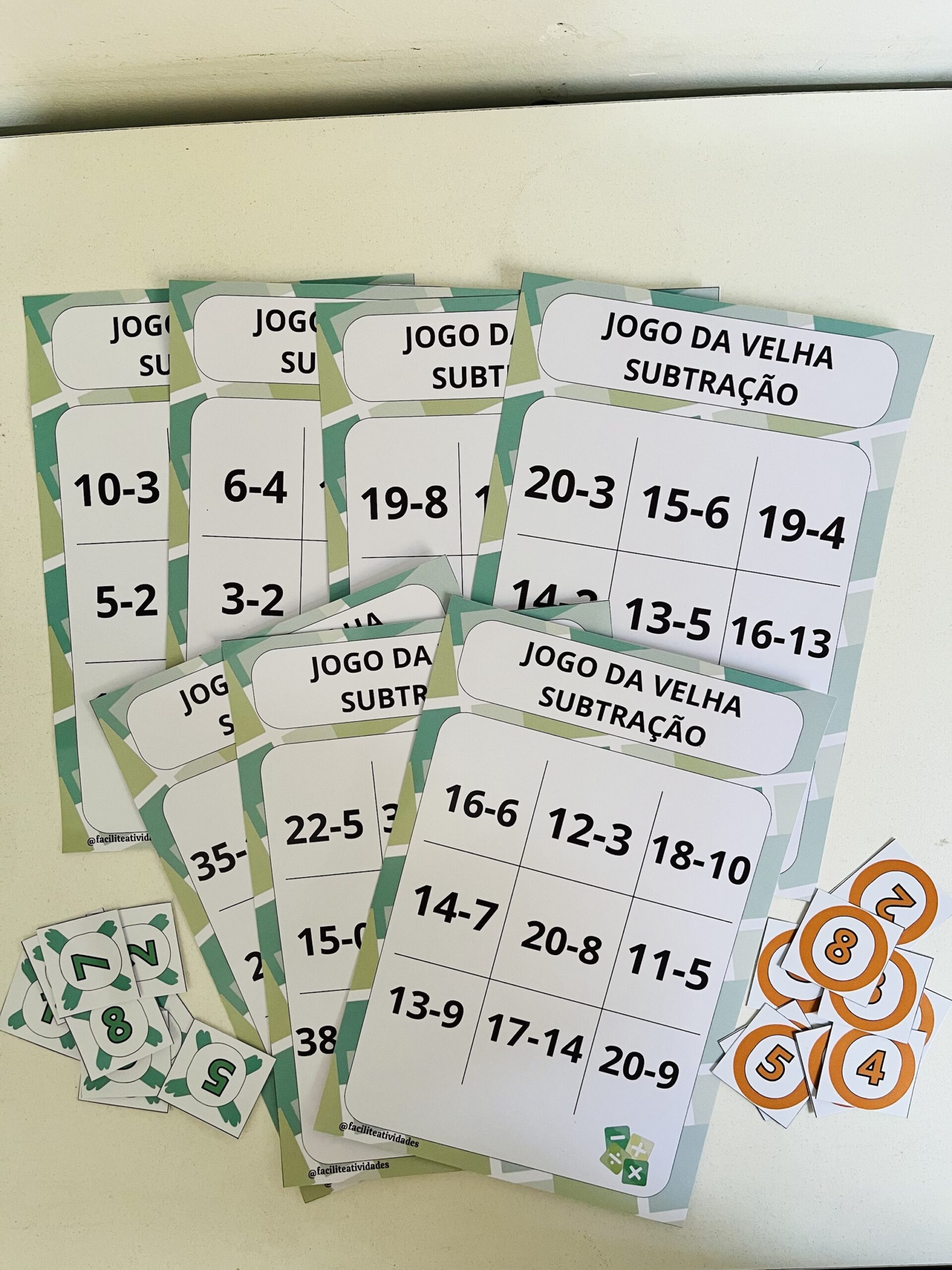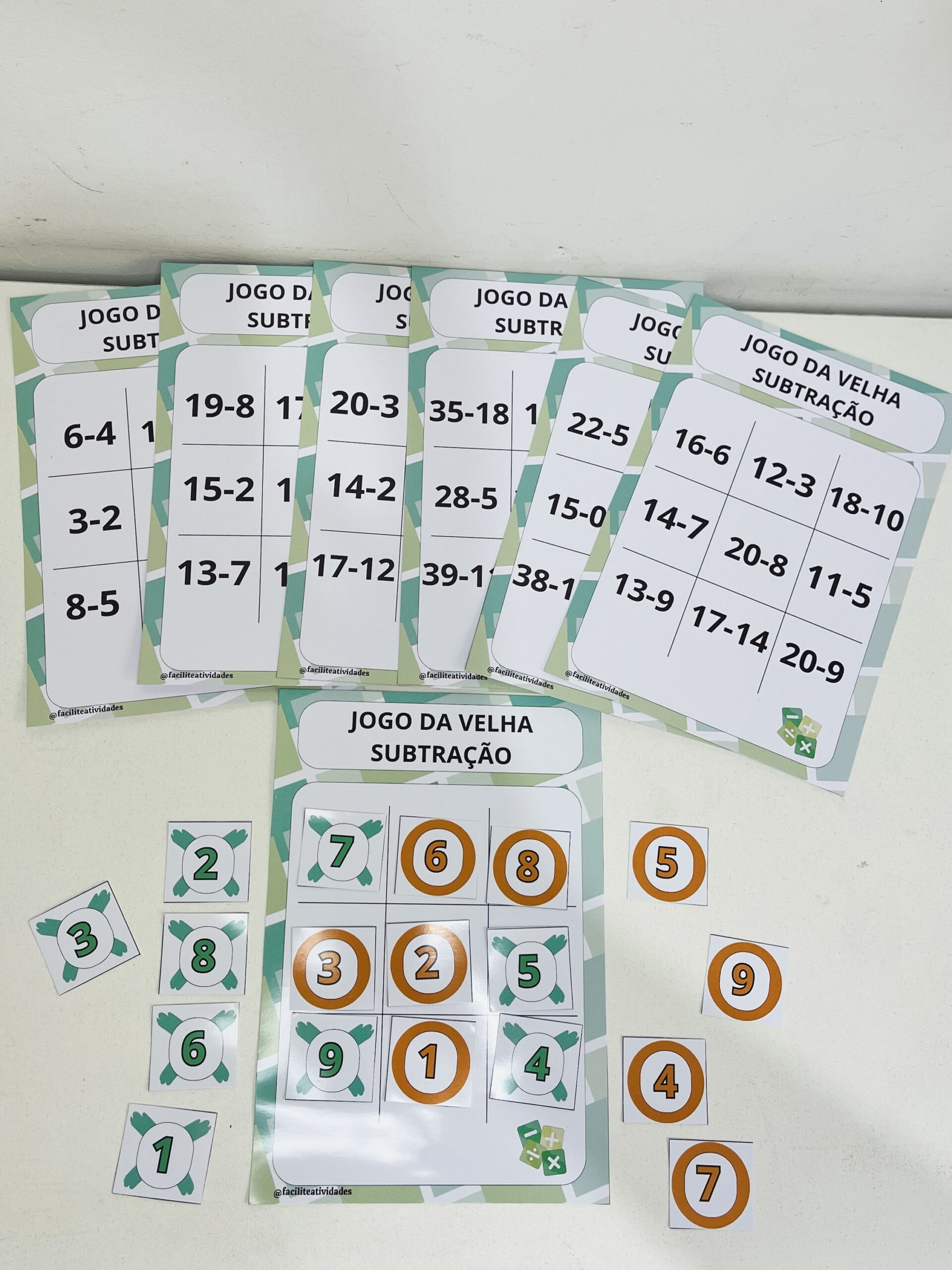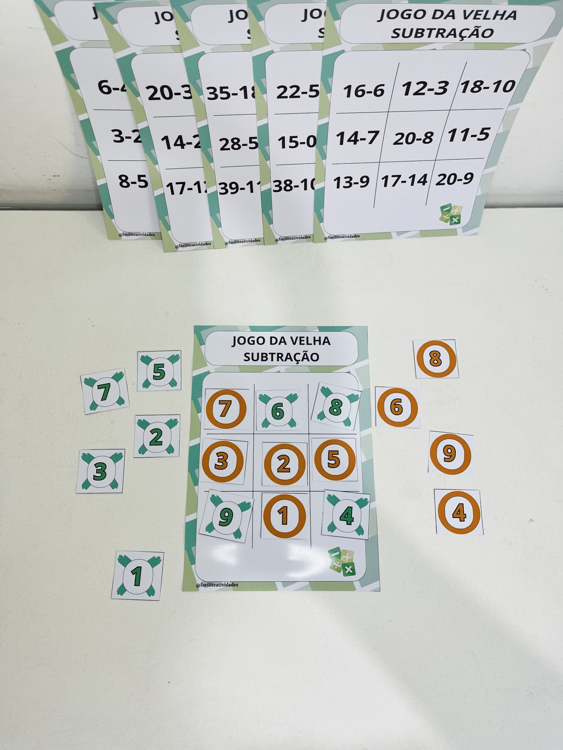 O Jogo da Velha da Subtração” é uma ferramenta educativa perfeita para ensinar matemática de forma divertida! O pacote inclui 15 cartelas cuidadosamente elaboradas, começando com subtrações mais fáceis (de 1 a 10) para iniciantes e progredindo para desafios maiores (de 20 a 40), ideal para diferentes níveis de aprendizado. O jogo vem com uma grade principal do jogo da velha (1 a 9) e peças coloridas (verde e laranja) numeradas de 1 a 9, permitindo que os jogadores marquem suas respostas. Combine aprendizado e diversão enquanto as crianças resolvem as operações e competem para vencer. Perfeito para professores e pais!