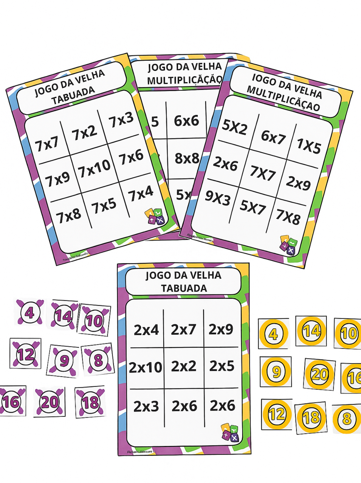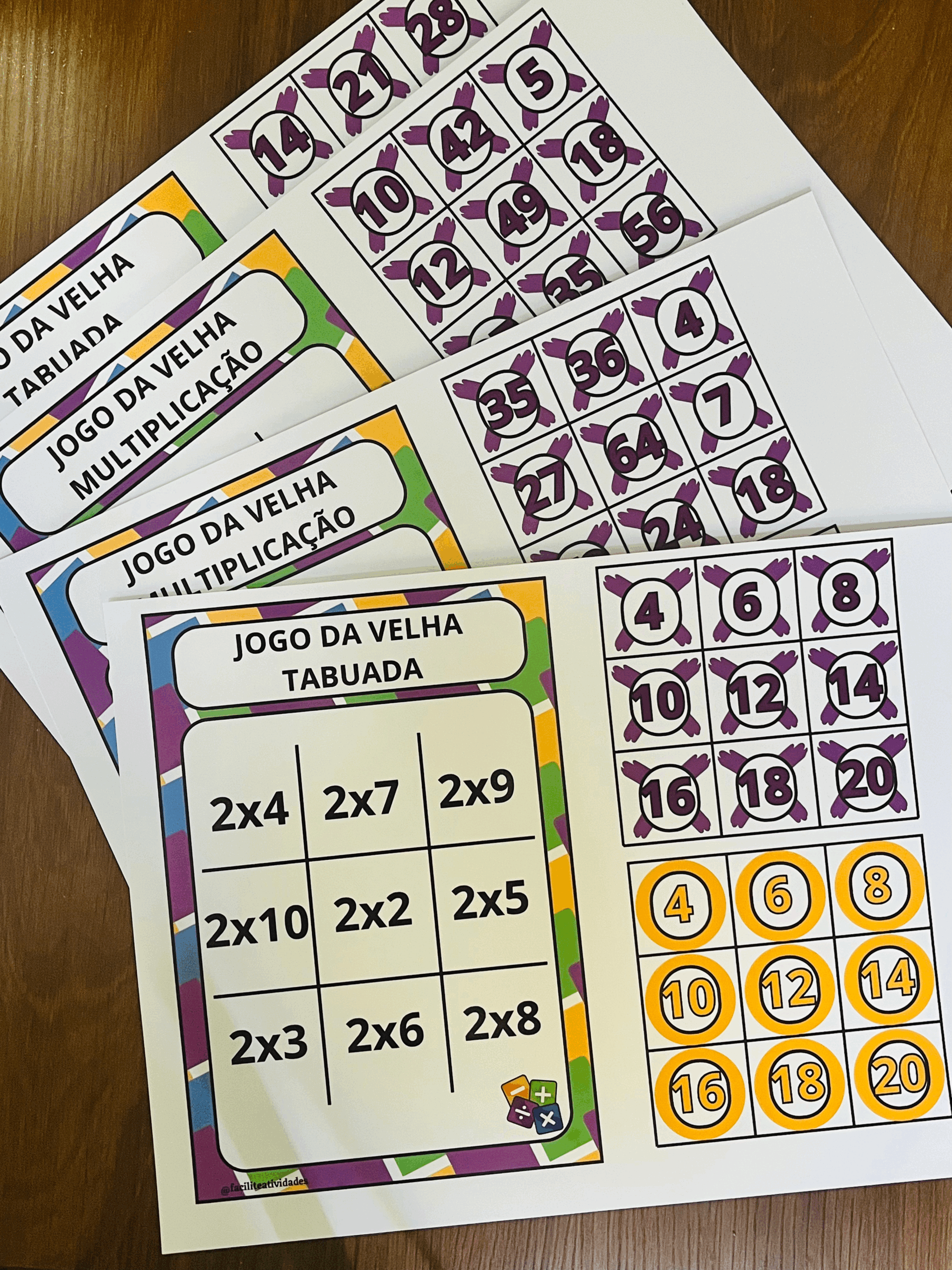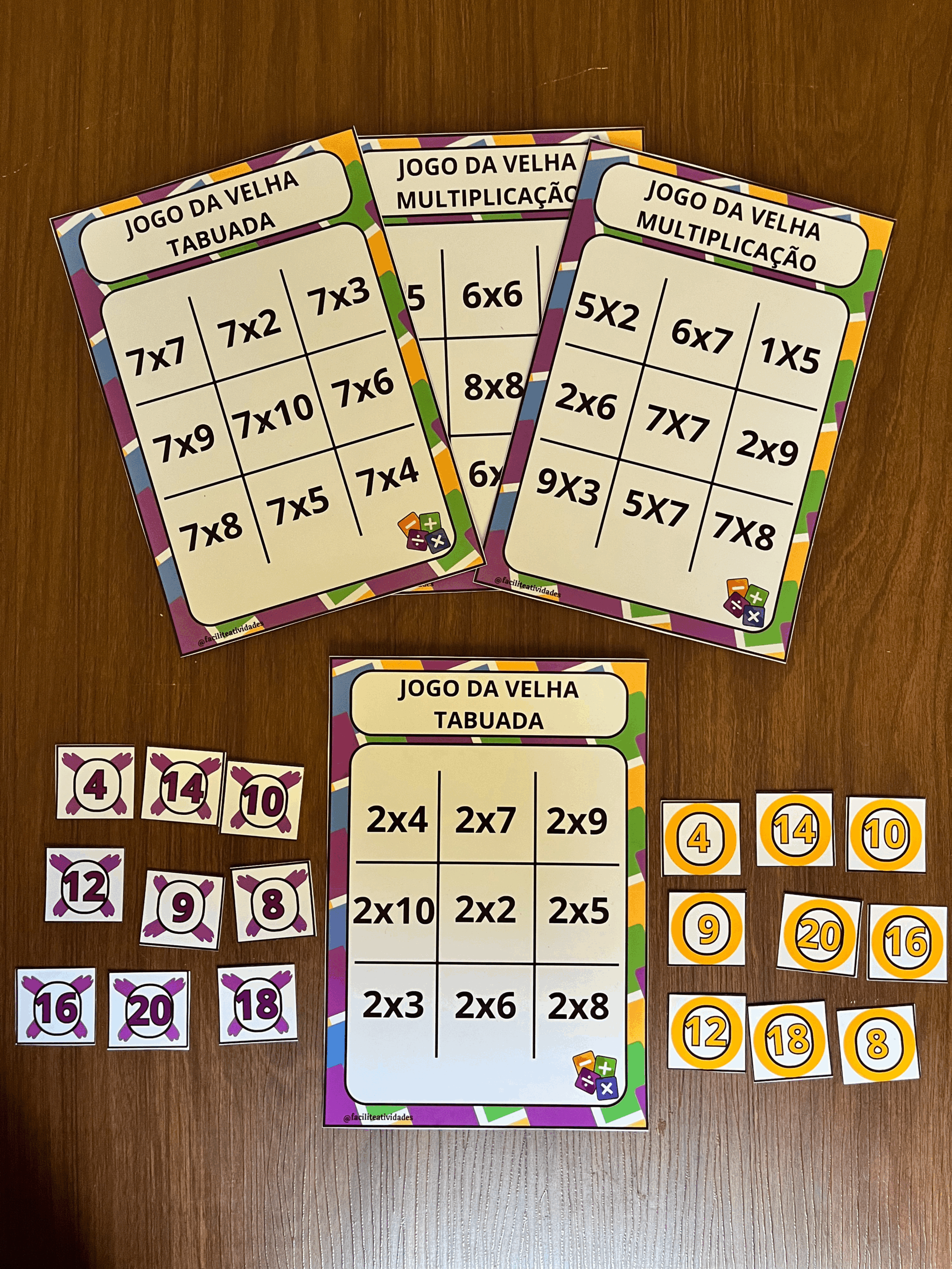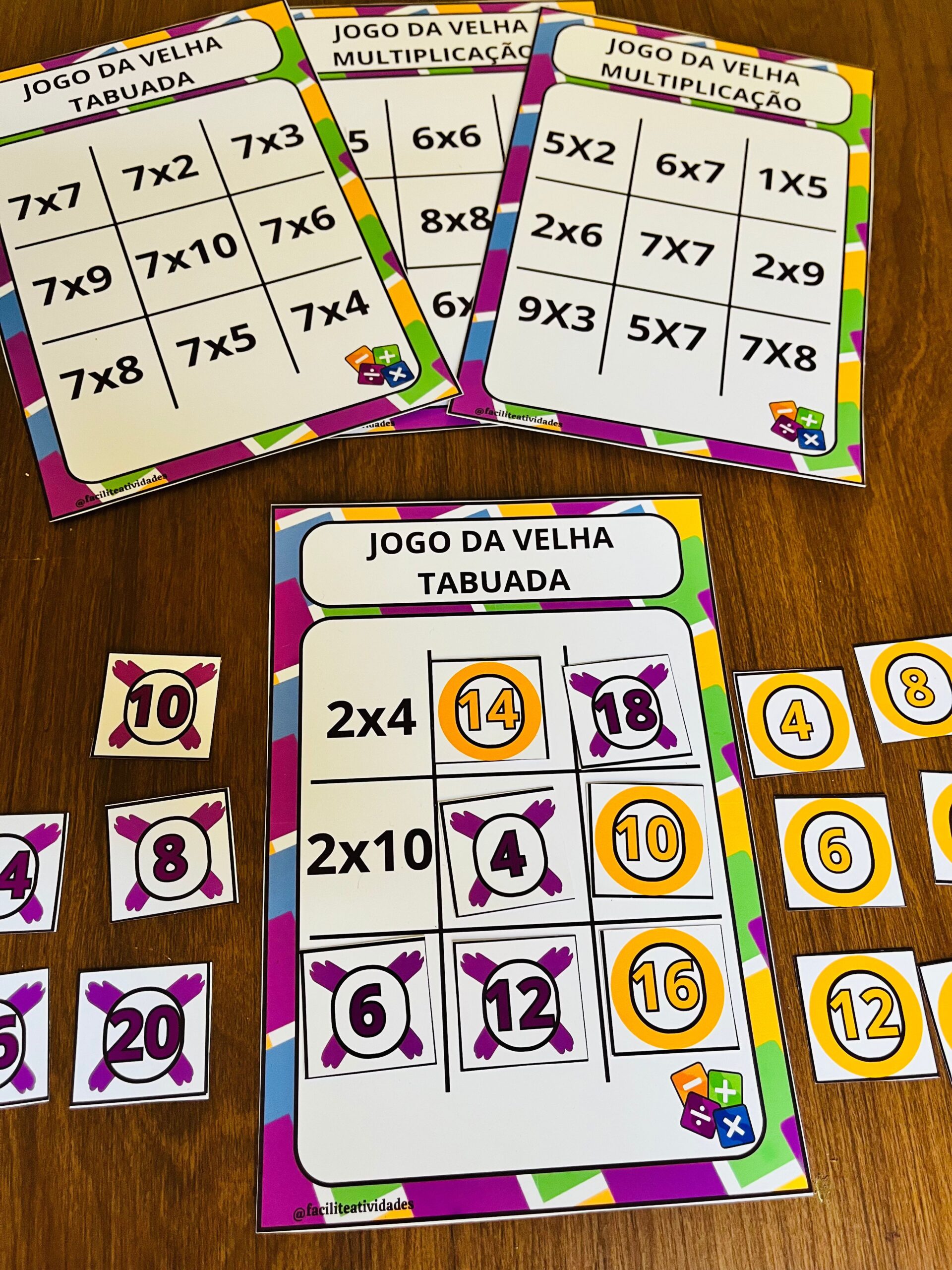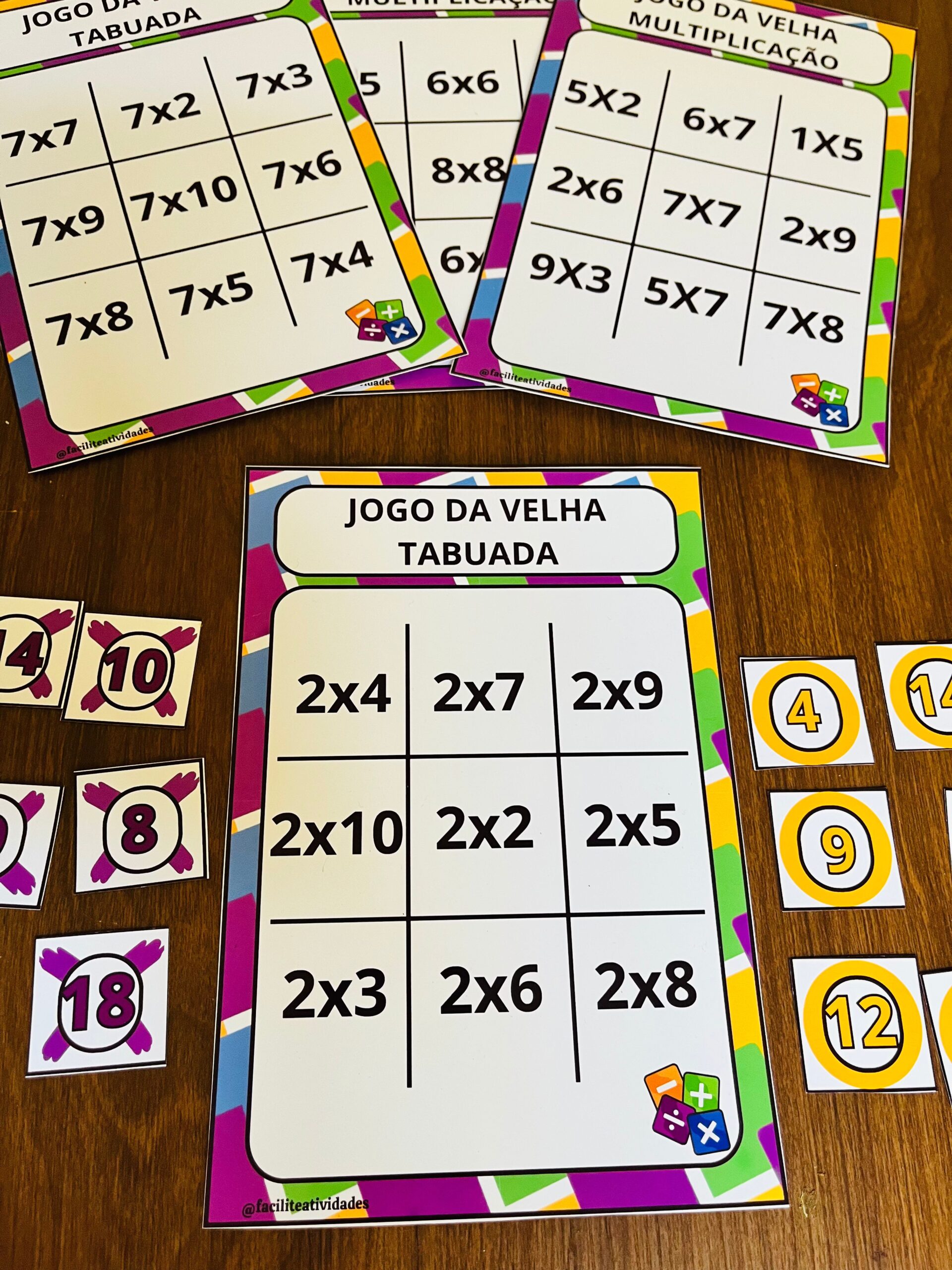 • Jogo da Velha Tabuada: 8 tabelas completas (do 2 ao 9), organizadas e coloridas, ideais para fixar a multiplicação de forma leve e prática.