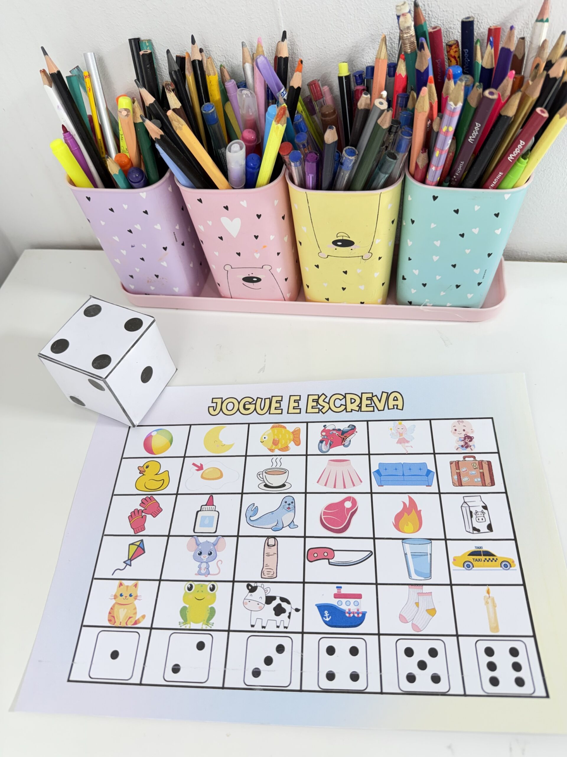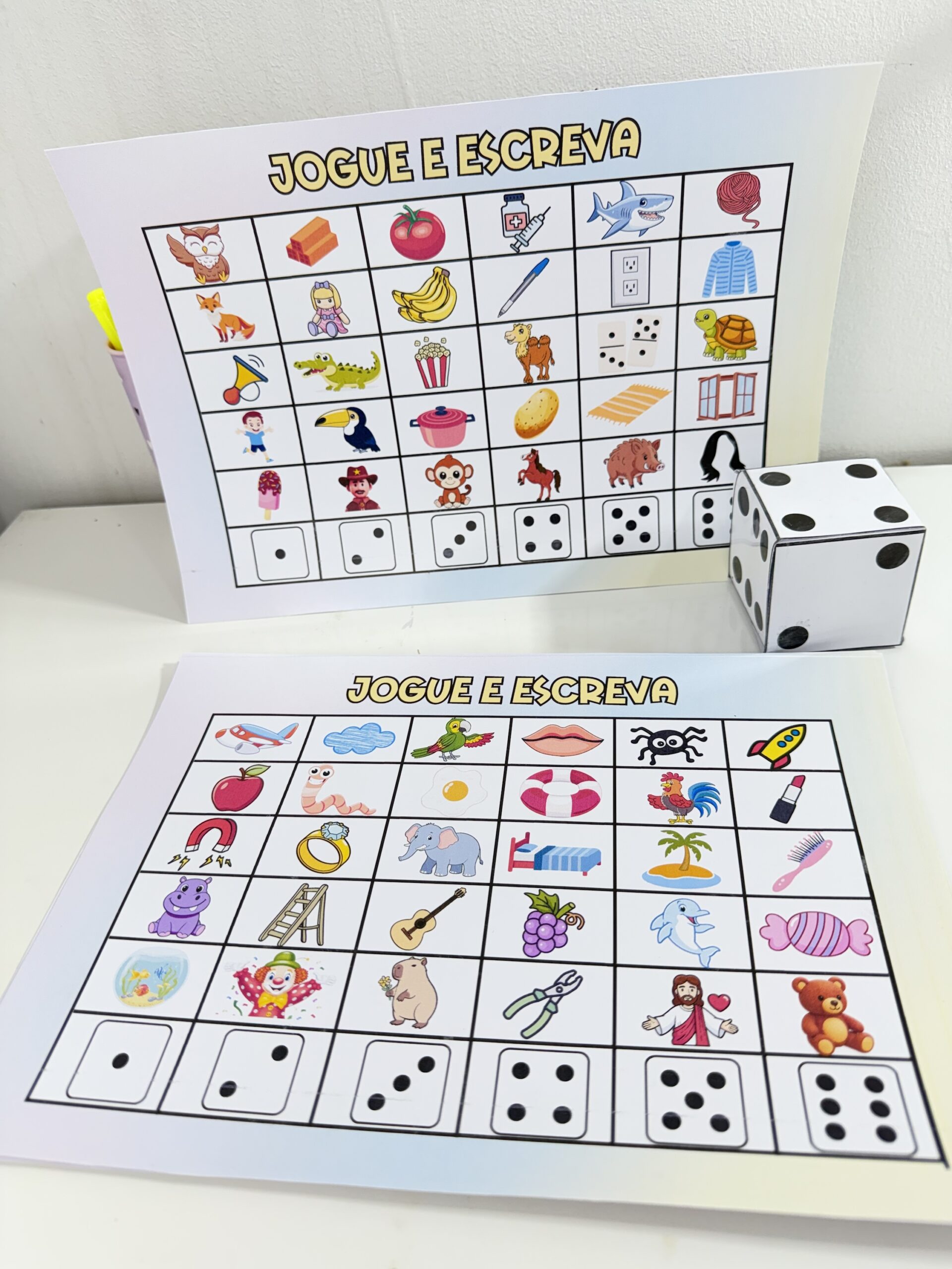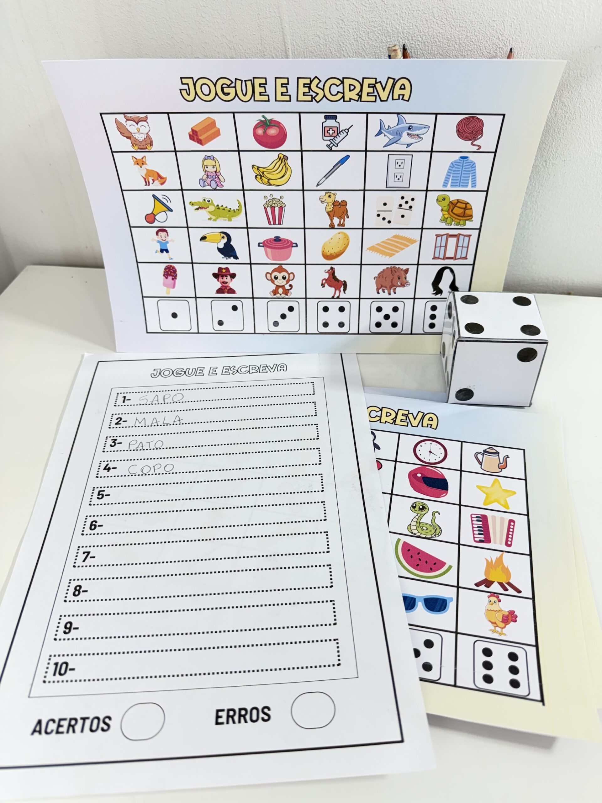 Atividade divertida 🎉 para crianças aprenderem a escrever palavras de forma lúdico 📝. Inclui 4 tabuleiros com 30 imagens coloridas 🌈, dados temáticos 🎲 e fichas de resposta com espaço para 10 palavras 📋, além de seções para acertos ✅ e erros ❌.