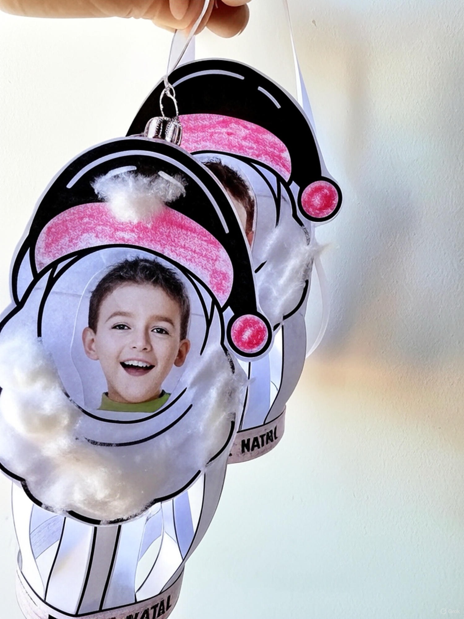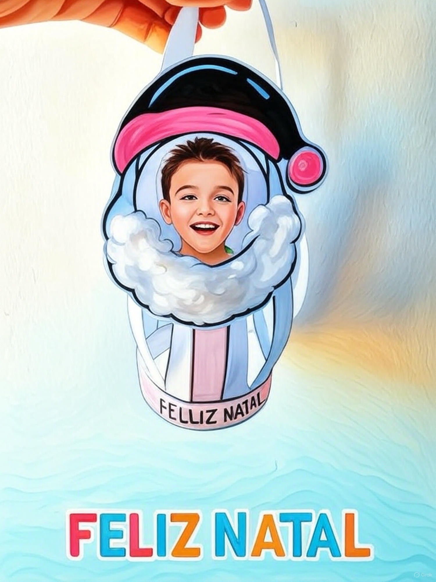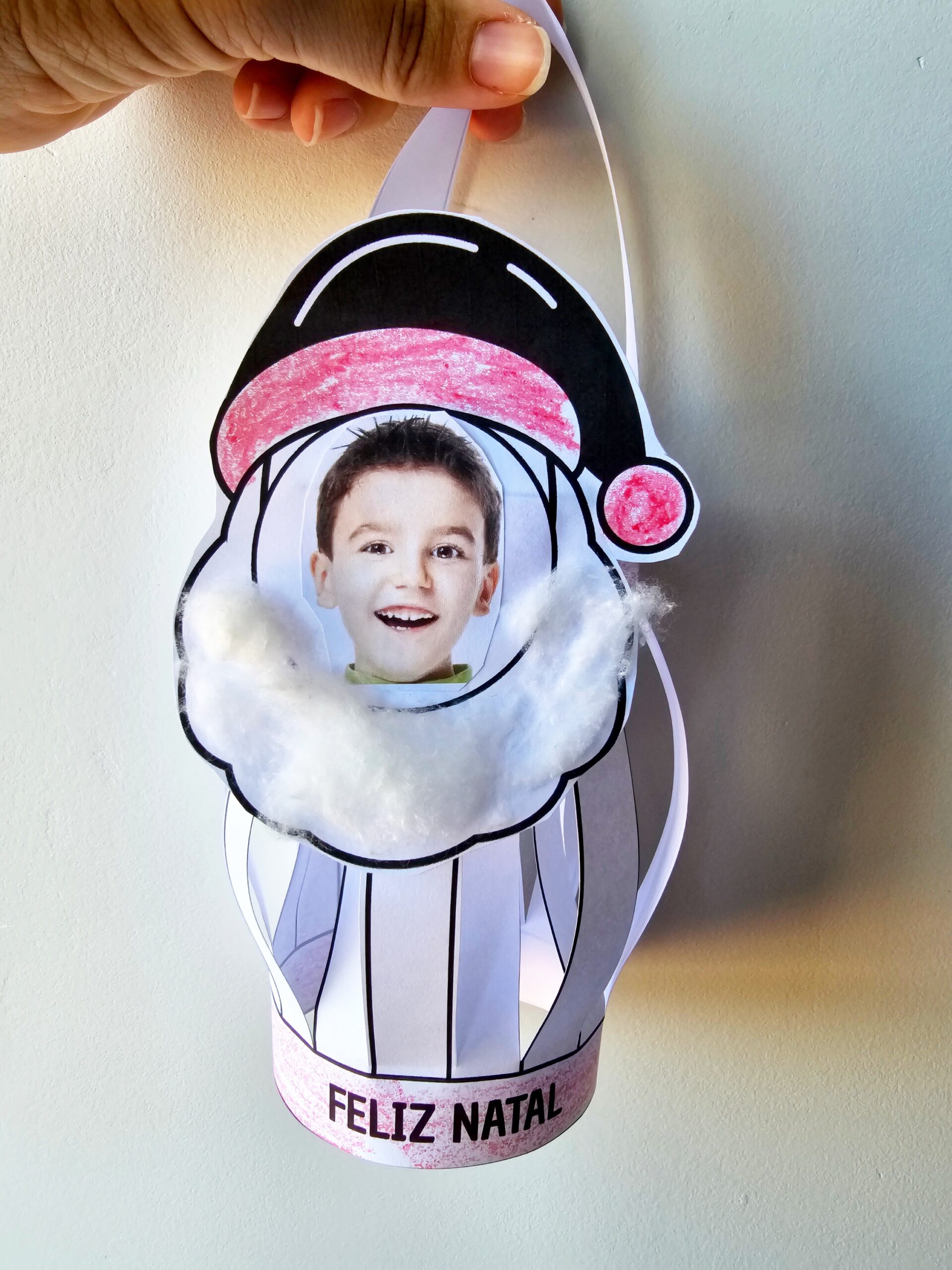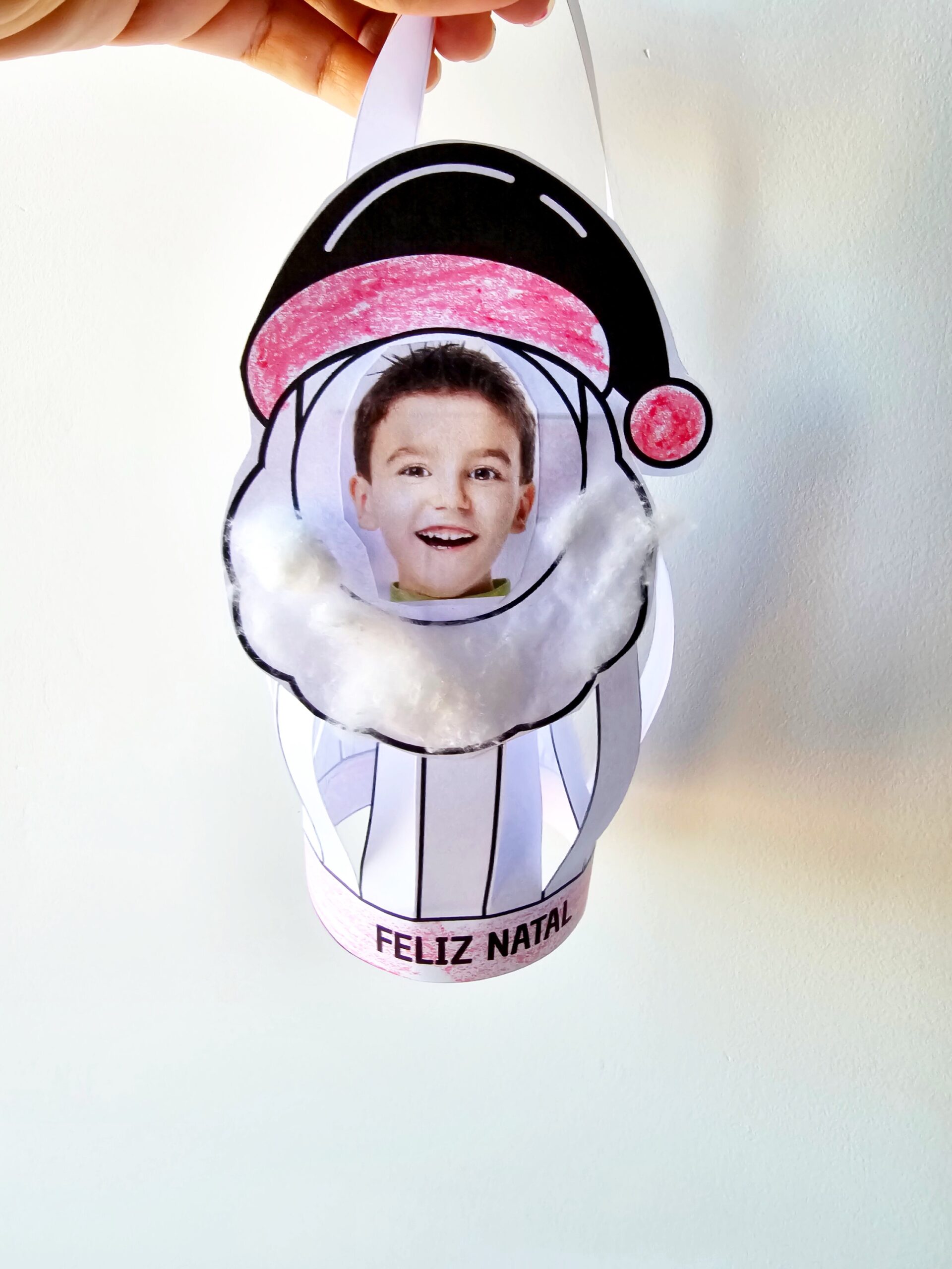 • Detalhes do Papai Noel: gorro com pompom, barba fofa (para colar algodão) e faixa inferior com a frase “FELIZ NATAL”;