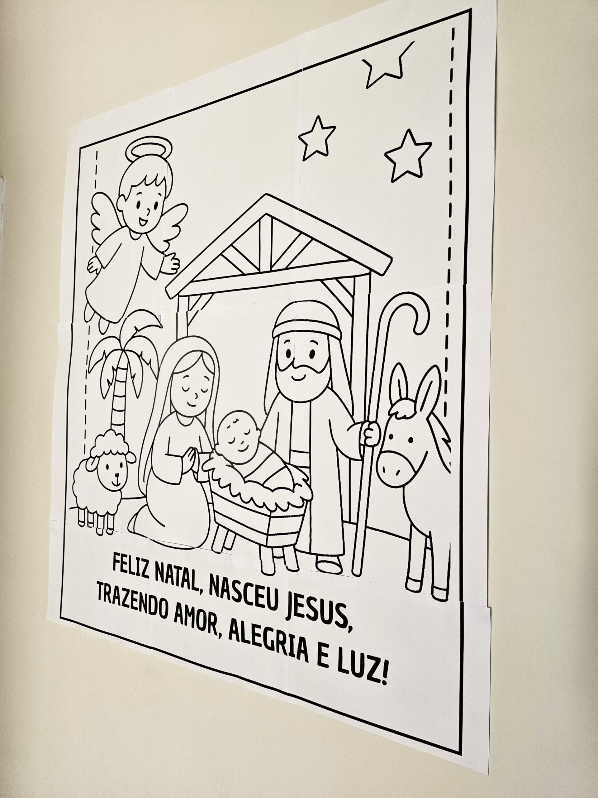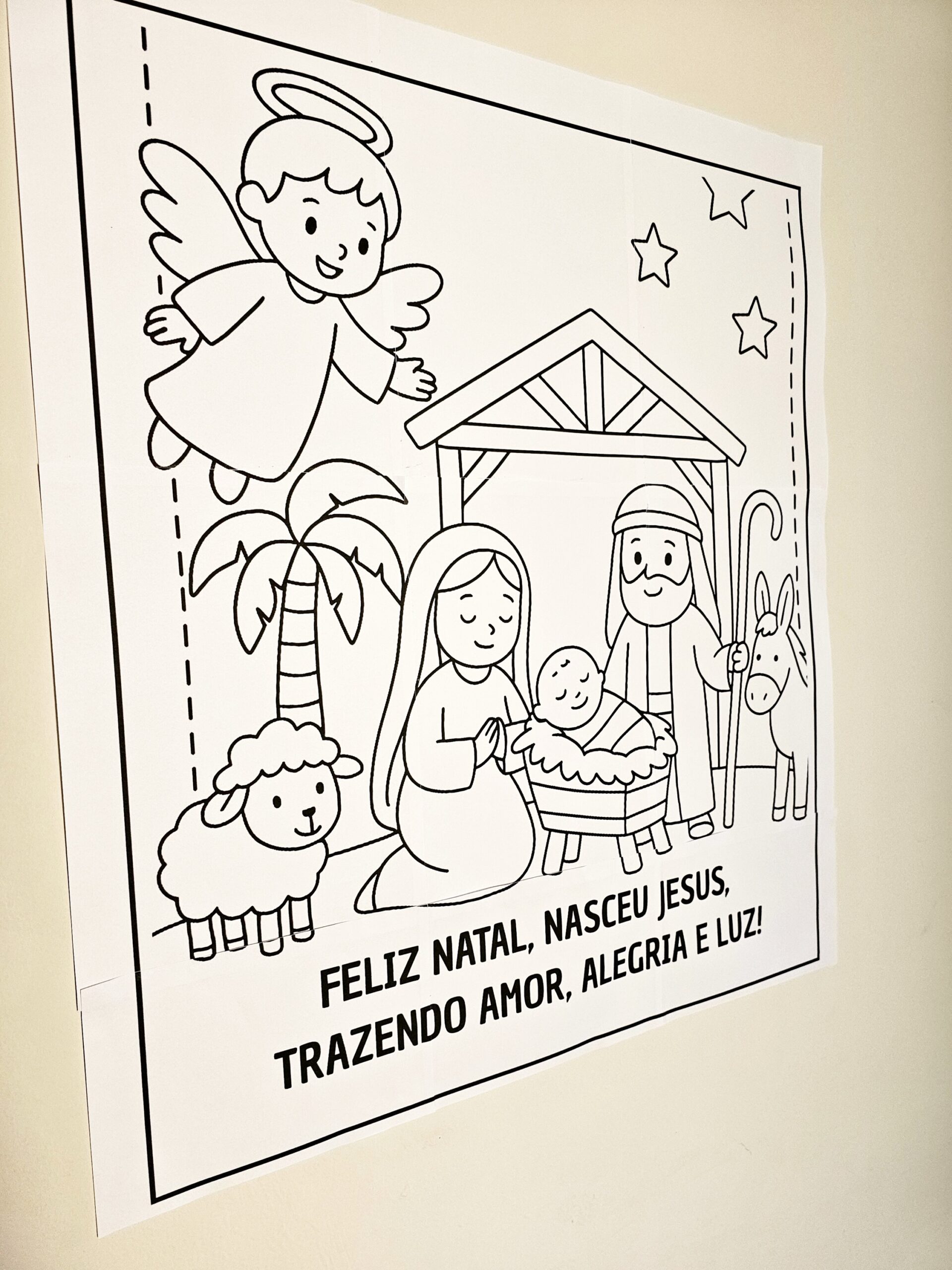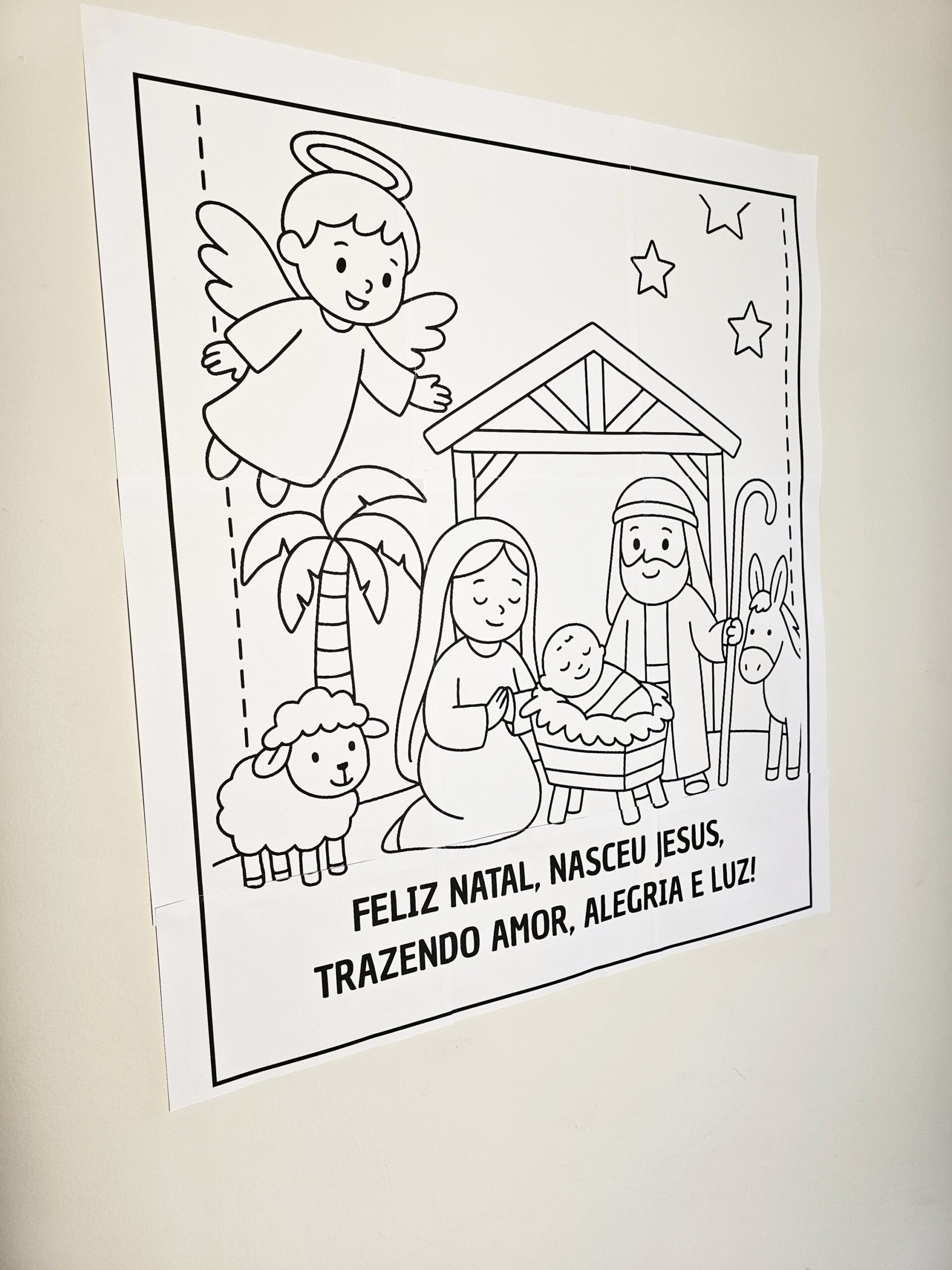 Este painel de Natal para pintar é uma composição ampliada em 9 folhas A4, formando uma cena completa do presépio.