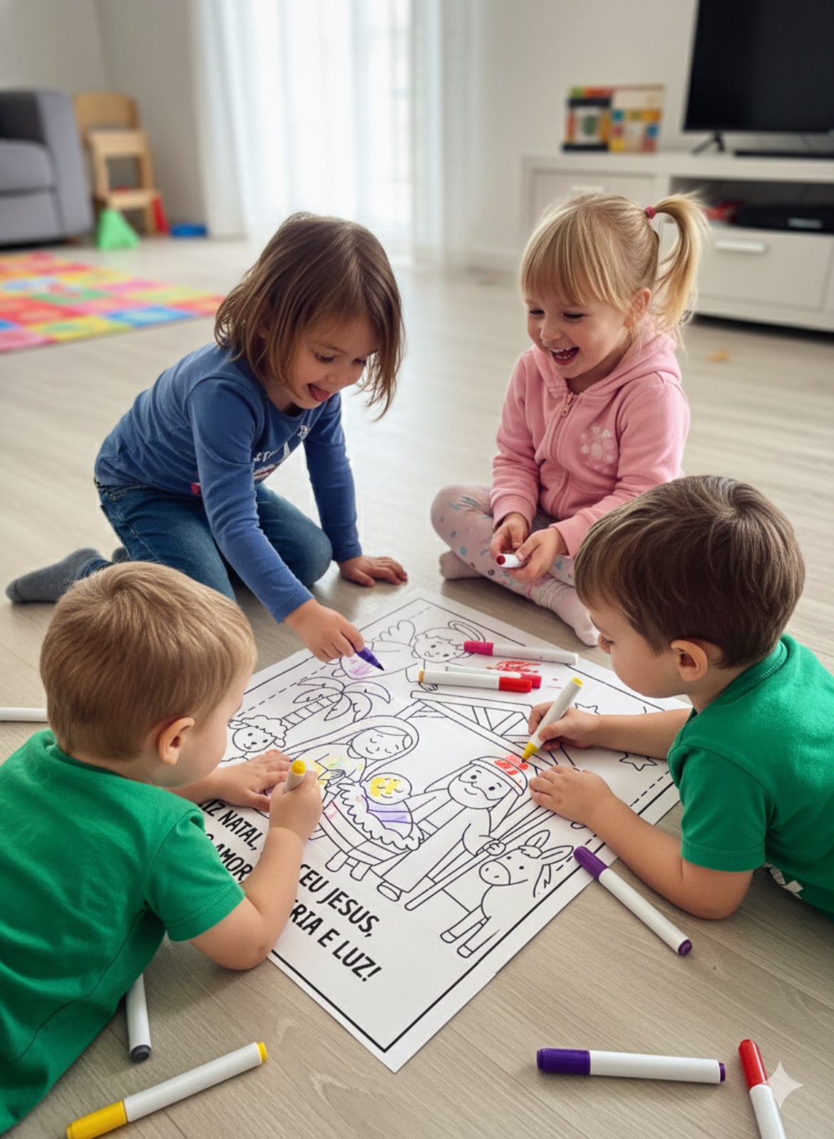 Ideal para colorir em grupo (crianças, catequese ou família), o desenho tem traços claros, expressões alegres e detalhes simples, perfeitos para pintura com lápis de cor, giz de cera ou guache.
