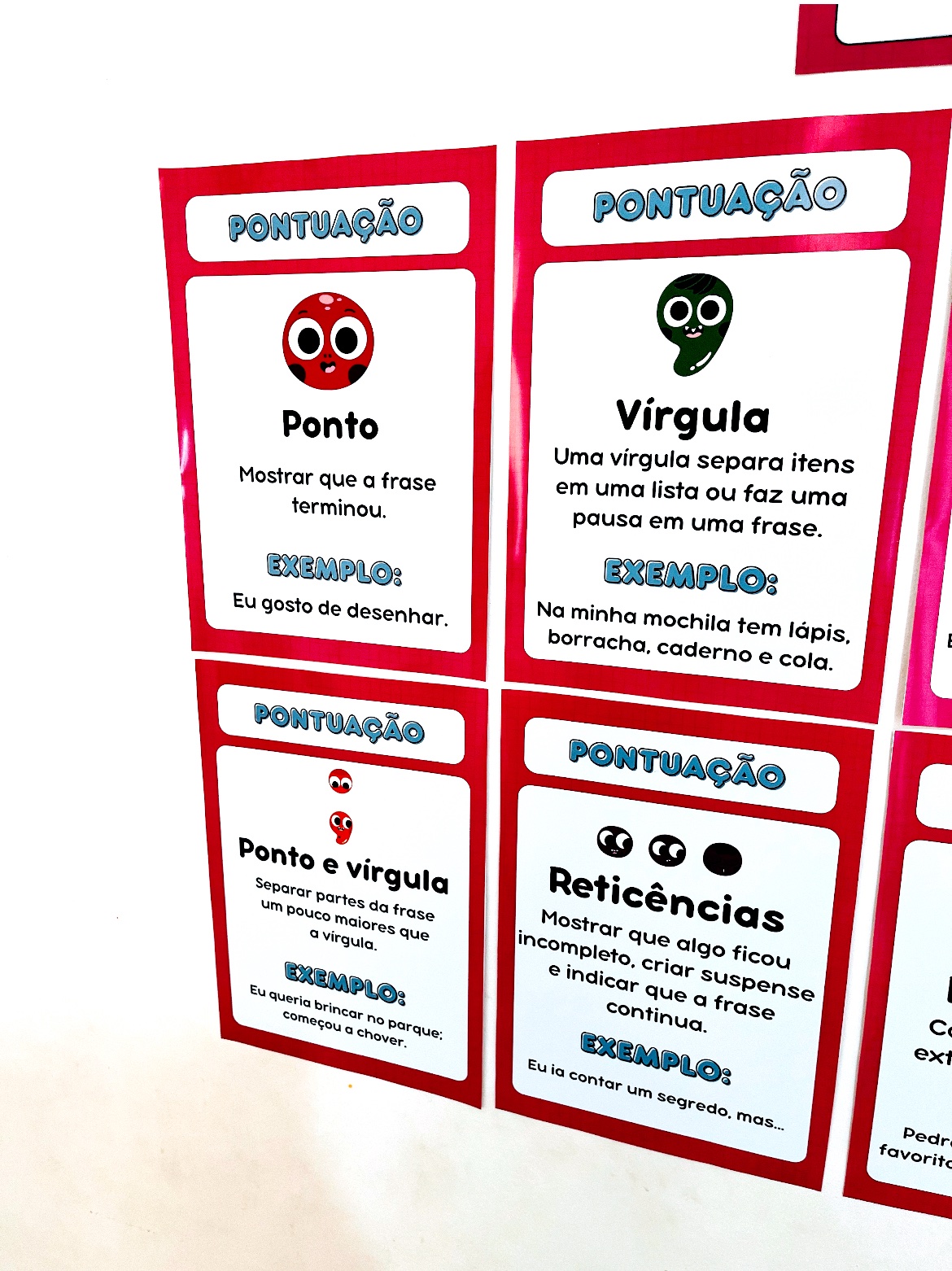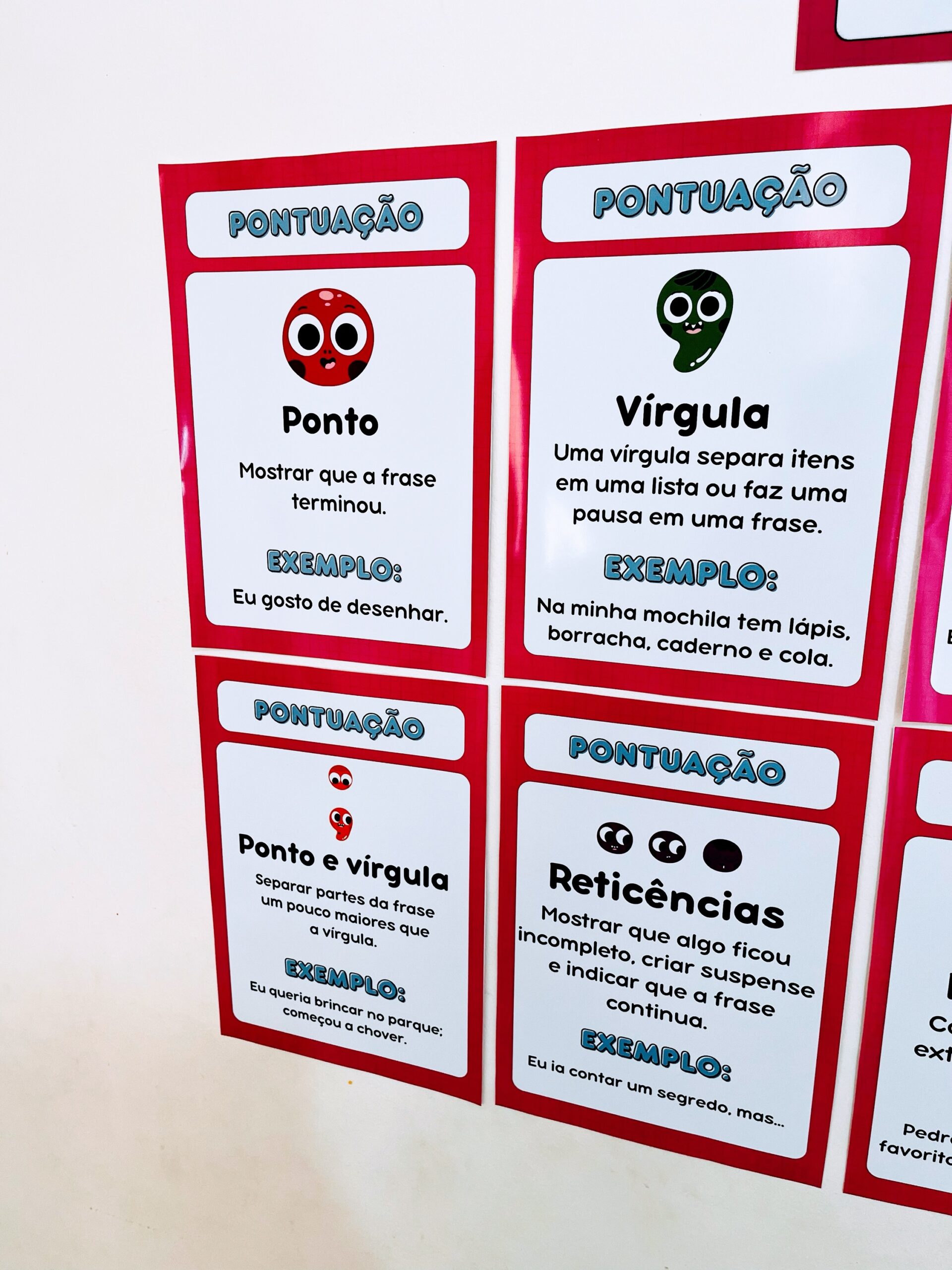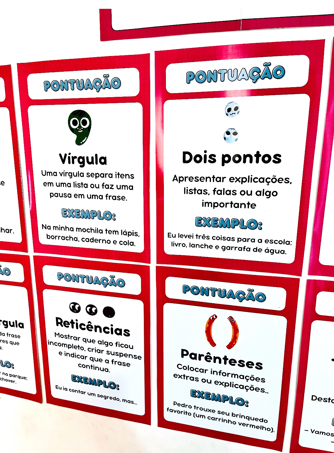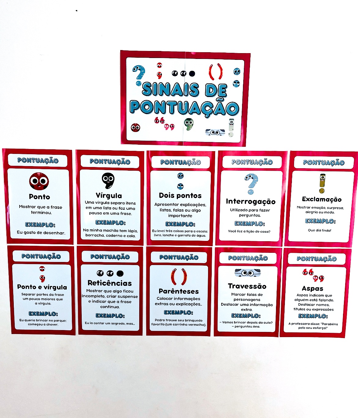 10 Cards Explicativos: Ponto final, vírgula, dois pontos, interrogação, exclamação, ponto e vírgula, reticências, parênteses, travessão e aspas.