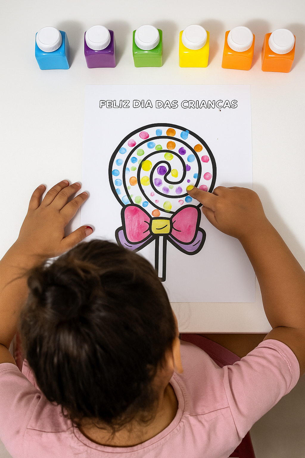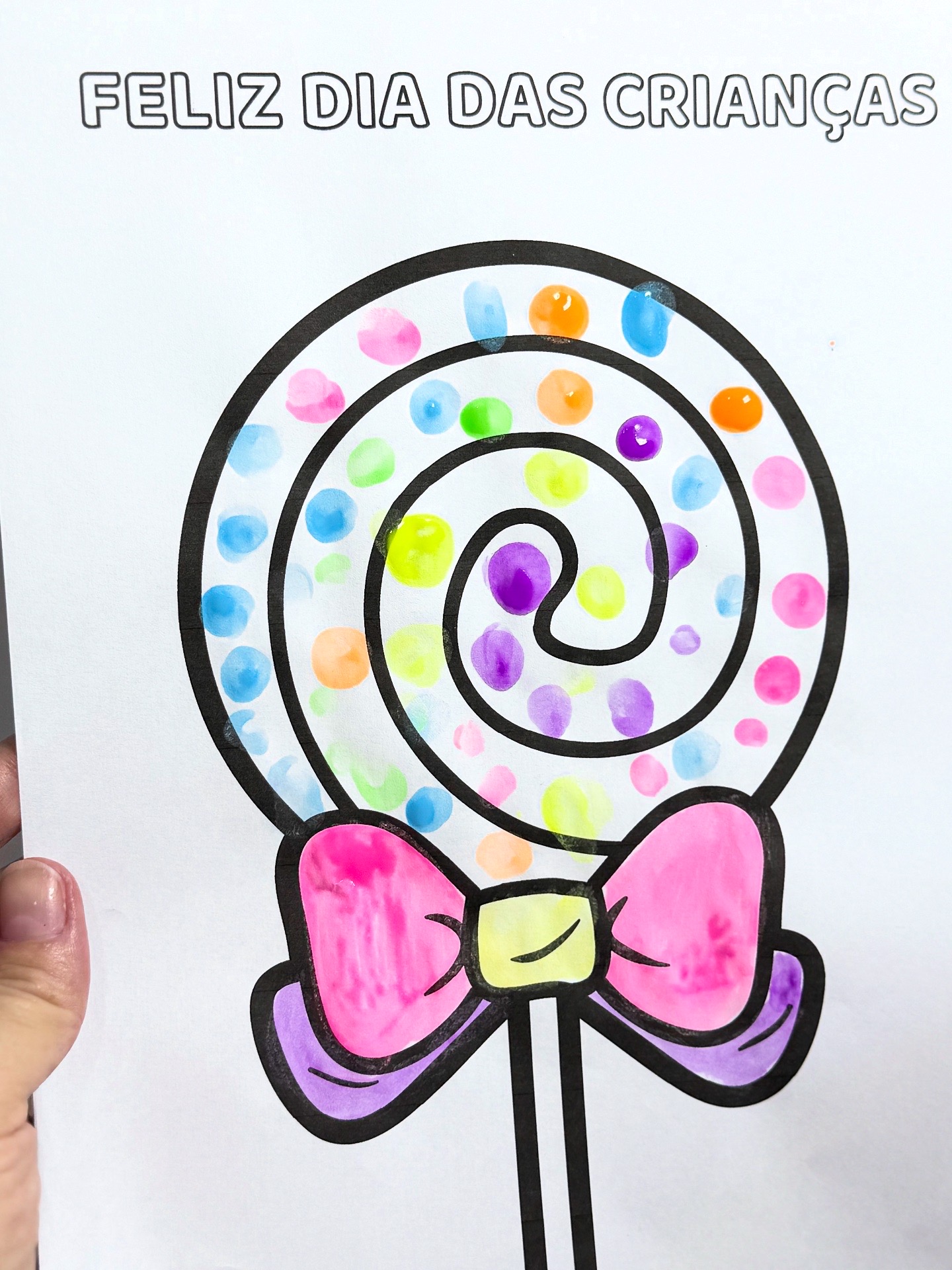A proposta traz a ilustração de um pirulito 🍭 com laço 🎀, acompanhada da frase “FELIZ DIA DAS CRIANÇAS” na parte superior.